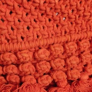 Trendy, chic & stylish with Boho flair. Cleobella Monaco hand woven macrame mini tote in color Salsa (orange red) with fringe tassels. Dual creamy white 6.5" resin handles & shoulder strap. Center zip compartment separates 2 other sections.