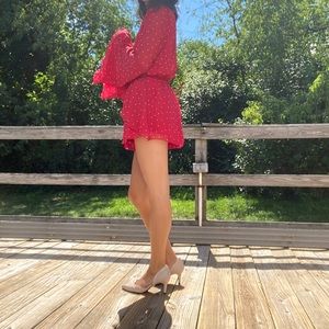 Red Polka Dot Tobi Deep V Low Cut Romper . Long bell sleeves with ruffled shorts , stretch in waist . Size S. Any questions , please don’t hesitate to ask ! 🤩