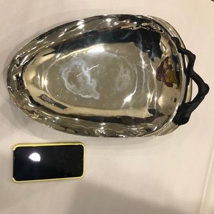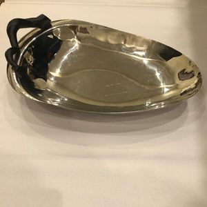Signed serving tray with applied blackened horn handle. Wonderful size for serving at a dinner party, beautiful table centerpiece when not used to serve food.