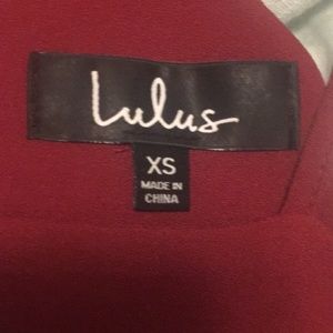 Stunning Lulu’s dress. Worn only once! Color is a beautiful wine color. Gorgeous neck line with scalloped detailing. Fully lined. Zippered back. Perfect for a wedding or formal.