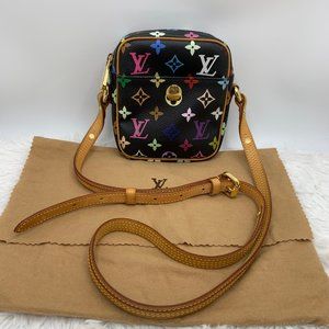 🖤 Features iconic black rainbow multicolor monogram pattern designed by Takashi Murakami, shoulder cross body strap, top zip closure, an internal slip pocket, an open front pocket and gold-tone hardware.