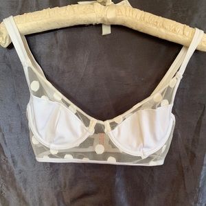 FLL NWT Clementine bra from For love and lemons polka dot mesh so cute bra pairs perfectly with the Clementine bodysuit which I also am selling. For Love & Lemons BLANC Clementine Dot Bra, US SMALL New With Tags. Stunning underwire bra with seamed, unlined cups. Thong is brand unopened in packaging !