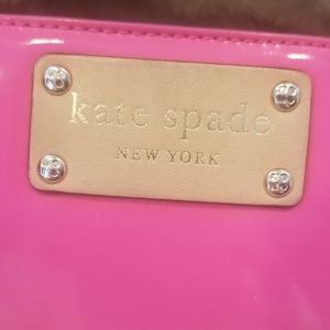 The front is a bright pink patent leather w/ a tan name plate & silver hardware. The back is tan & there is a newspaper print on the inside of each pocket! The red in one of the photos is not a mark...it is like someone circled an ad in the "paper."