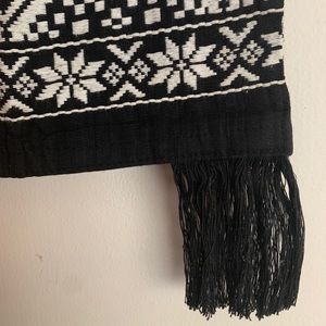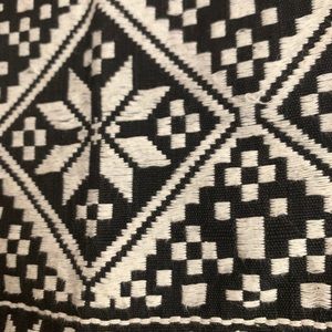 This intricately embroidered bag features a wide embroidered strap and fringe detailing on the bottom. The black and white colorway matches all outfits.