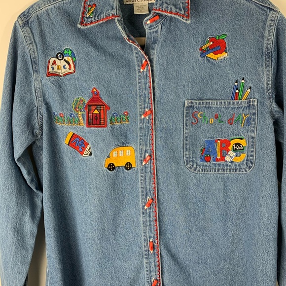 • Features: long sleeve, school themed, embroidery detailing, appliqué vintage denim shirt, teacher’s shirt, buttons in shape of crayons, plastic buttons, teacher/ school decorations and detail, 100% cotton, made in Hong Kong