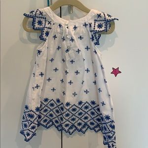 Perfect for a hot day! Your girls will look lovely in these beautiful white cotton dresses with blue embroidered flowers, flutter sleeves. Three buttons at back. Sizes 2/3 and 3/4.