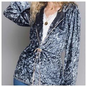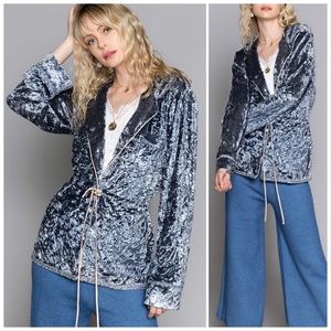 A Crush velvet cardigan with waist drawstring and Champagne Lace Detail.