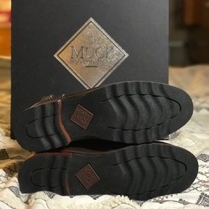 Brown leather women’s muck boots. Size 6. Brand new in box. Never worn. There is a neoprene like material that stretches in on the upper back heel that helps when sliding boot on.