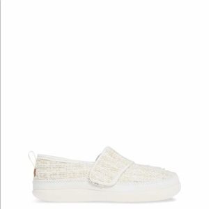 Toms Inca Woven Sneaker in White, Girls Size 4, Brand New in Box!, Adjustable hook-and-loop strap closure, fleece-lined, round toe with bumper, woven textile construction, slip-on style, back pull-tab, white sole, textile upper, manmade sole