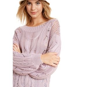 Lavender pointelle lacy cable sweater has a ribbed round neck and can be worn on or off shoulder. This soft versatile sweater can be paired with dress pants or a pencil skirt for work.