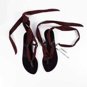 Brown sandals with stretch fabric ties. Rubber sole. Size 35. New with tags.