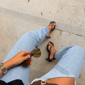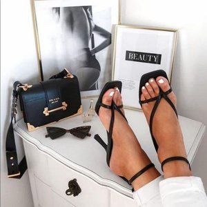 !!NEW!! Square Toe Ankle Wrap Thong Heels – Black