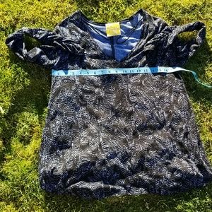 FREE PEOPLE Hi-Lo V-neck top. Black & blue floral print. Long sleeves with ruching at wrists and raw edges on shoulder seams. GUC Size XS