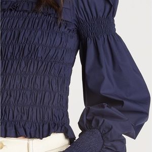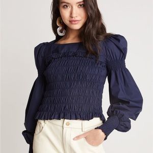 NWT beautiful navy blue top with boat neckline and smocked balloon sleeves