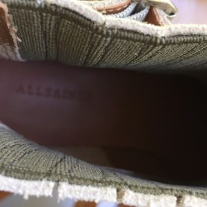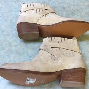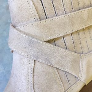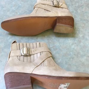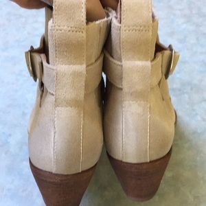 Beige suede boots with elastic top and adjustable buckle. Never worn and in good condition. Slight stain on top right strap as pictured. Low wooden heel.