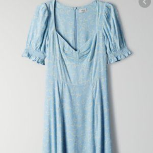 Brand new and never worn Tome Dress from the Wilfred line at Aritzia. Between 24-26in waist will be the best fit. Invisible zipper in back, gorgeous pale blue color with white patterns. Puff sleeves. Sweetheart neckline. Sexy slit up the side. Completely sold out online. Comes in the iconic packaging. Size 2.