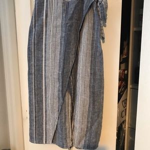 Express knee-length linen dress with spaghetti straps. Has cut out at stomach and bow at the waist. Tulip hem with slit in the middle. Zipper back with elastic. Perfect for a casual night on the town