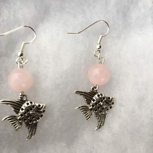 These beautiful earrings are made with natural pink rose quartz and silver tone angelfish charms. The hooks are sterling silver plated and hypoallergenic.
