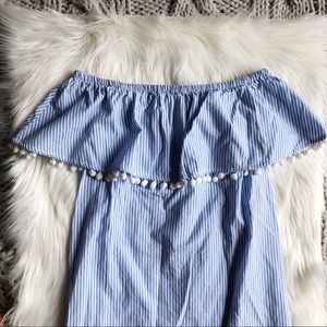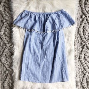 Has elastic in the shoulder area, and a pom pom design on the bottom