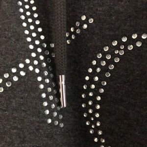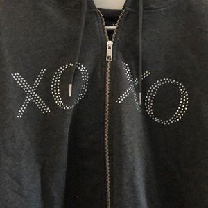 NWT XOXO Dark Grey Embellished Hooded Sweatshirt. Thin and light. Full zip style and 2 drawstrings for the hood. 60% cotton and 40% polyester. Brand new, never worn.