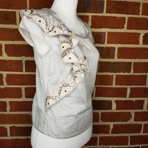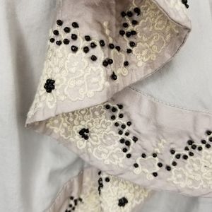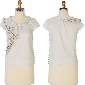 Anthropologie Leifsdottir Fanned Flames Top in Size 0. Cascades of embroidered silk fall like iced waves from Leifsdottir's twisted scoopneck. Very rare blouse. Side button closure. I love the buttons up the side! Detailed fan of ruffles embroidered with delicate beads starts on the back neckline and cascades down the front. Beautiful rolled neckline. 100% cotton. Incredibly soft. Excellent preloved condition.