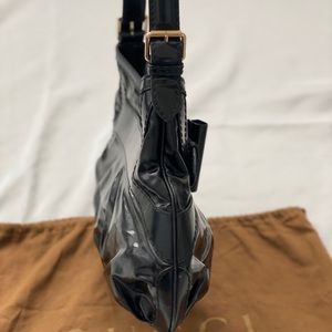 189885 001013 This luxurious handbag is very versatile. The bag features a looping patent leather shoulder strap with brass buckle links and the bag is cinched at the face covered by leather straps and a decorative black bow. Room for all your daytime/evening essentials, easy to clean! Includes dust bag.