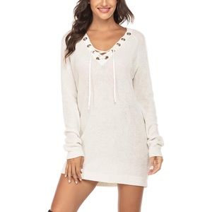 Lace Up Deep V Chunky Knit Sweater Dress Ivory