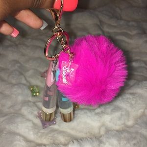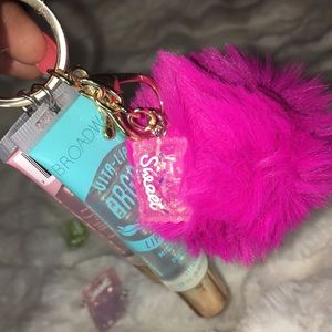 pink keychain with two broadway lipgloss and sweet candy charmed ! 💗 never lose your gloss again ! you can pair it with a purse car keys bookage ANYTHING ! 🤍