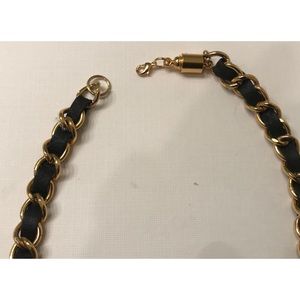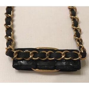 Vara bow with black grosgrain ribbon taken from a pair of shoes on gold tone & braided black faux leather necklace. Necklace is vintage but not designer.