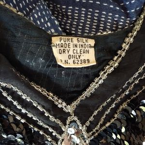 I'm unsure of the decade of this sequins top... I'm guessing mid- late 70s. Stunning cropped sides, flutter sleeve black and silver blouse. Sequins shows some wear along top shoulder, but you definitely can't tell. Peep the Posh-Story to check the video clip.