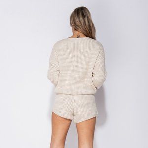 Slip into the Dressed to Chill Beige Ribbed Long Sleeve Sweater Top and Shorts Lounge Wear Set and get ready to for a laid back day! Soft and lightweight basket weave knit, with some stretch, shapes this casually cut top with a wide boat neckline (that falls off the shoulder for a cool slouchy look), long sleeves, drop shoulders, and a slightly slouchy bodice. Pair with the matching shorts for a complete look!