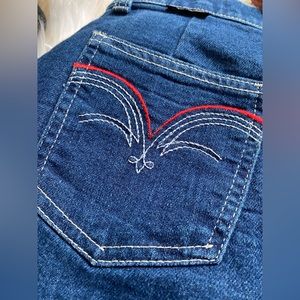 ✨Rare ✨ Great pair of vintage Wrangler Denim Jeans! High waist, Wide Leg, Short - hemmed by previous owner. Red & white stitched design on back pockets. “Wrangler” tag intact on back right pocket. Has some fading at the creases where they’ve been ironed.