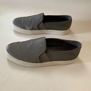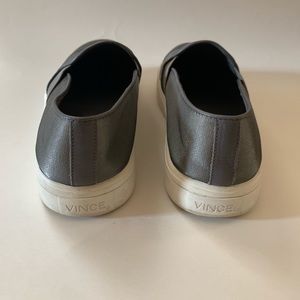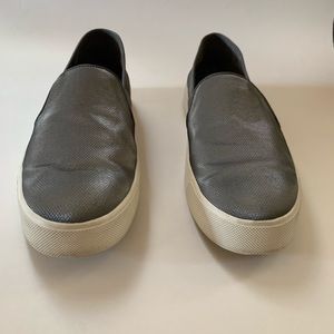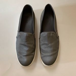 EUC Vince Preston slip-on sneakers in a metallic gunmetal/pewter color. Textured material with leather trim. No major flaws besides slight wear on soles, and light scuff marks. Can easily be brightened up. Insole is clean and fully intact. Lots of life left in these casual cool sneakers!