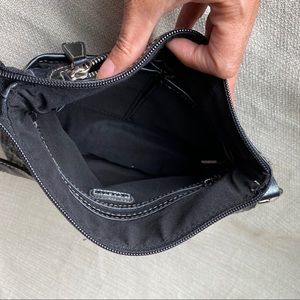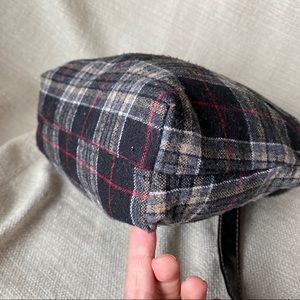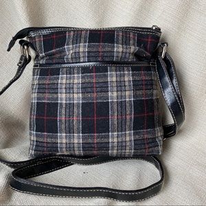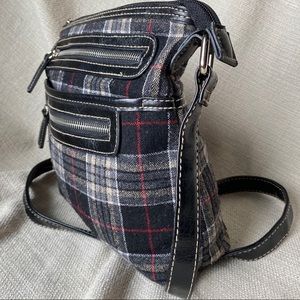 Plaid fabric bag with black vegan leather accents and adjustable strap. Bag has two exterior zipper pockets and two slip pockets. Zipper closure. One interior zipper pocket and two slip pockets. Bag is in VERY GOOD used condition with some exterior pilling. Smoke free home. Ships same or next day.