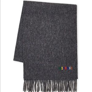 100% wool Missoni scarf. Dark grey marled wool. Embroidered logo in multi color. Fringe trim. Approx 13” x 70”. Made in Italy. Unisex. Brand new with tags.
