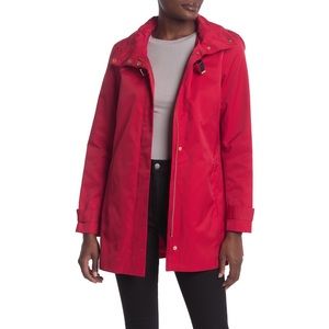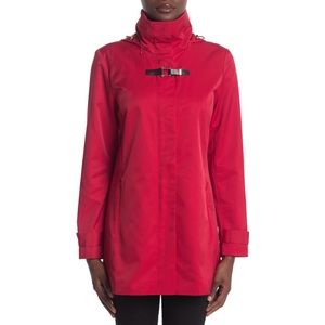 A chic, versatile jacket features a stowaway hood, stand-up collar, and front zipper pockets to keep you covered on the go.