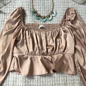 Crafted in a soft + luxe champagne silk, with a square neckline and scrunched long sleeves. Finished with a cropped finished hem and ruffled sleeves.