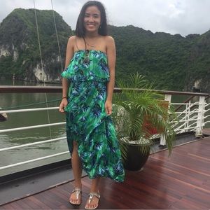 This lovely dress is very flattering and comfortable. The fabric is light and flowing....the kind of dress that catches the breeze and feels so good to wear. It’s both beautiful and comfortable and can be worn casually or to a fall or summer wedding. The top is tiered with boning in the bodice and an invisible zipper at the back. The removable straps are optional. Fully lined, fit at chest and more relaxed at the hips and legs.