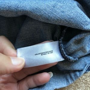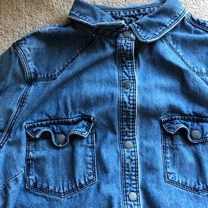 Worn gently and looking for a new home! Straight silhouette with a relaxed, easy fit. Hits at the hip. Long sleeves with snap buttons, spread collar, and snap flap front pockets. Perfect for fall!