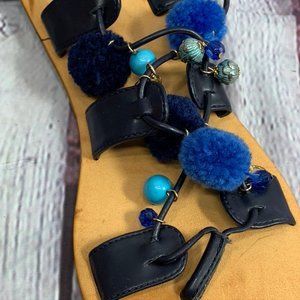 BP. Laney Blue Pom Pom Tassel Twinkly Beads Ankle Wrap Lace Up Sandal SZ 7.5