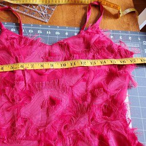 Swishy, twirly knee-length cocktail dress with all-over eyelash lace. Adjustable spaghetti straps, sweetheart neckline and a center back zip. Bought from Zulily, never worn. Runs small, please see measurements in pictures.