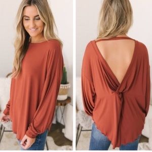 A drapey open back provides an unexpected finish for this perfectly slouched long-sleeve top.