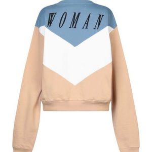 Off-White c/o Virgil Abloh Horses “Woman” Crew Neck Sweater in White/Blue/Tan