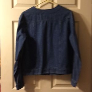 Lightweight denim jacket, long sleeves, zips up the front. Has pearls and stones around the neck front and on pockets.excellent condition with no stains are tears .can be worn alone or with a top underneath.very nice.