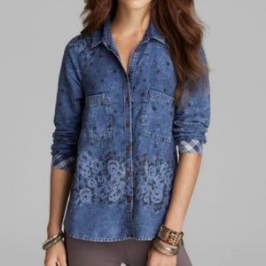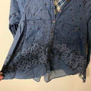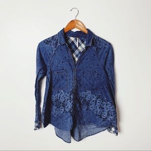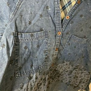 dark denim button down top from free people. multiple different patterns: floral, plaid, solid. wide fit bottom. size extra small. good pre owned condition.