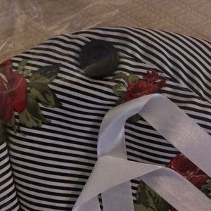 Hand made surgical Cap/ Bonnet with button to hold mask. Ribbon attached for hair bun. Black Stripes with red roses, white ribbon and back button. One size