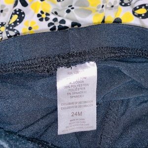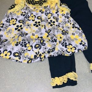Bottoms are leggings with yellow ruffles bottoms