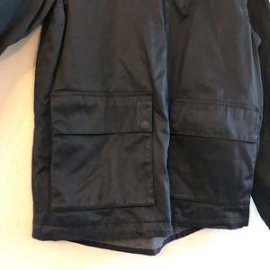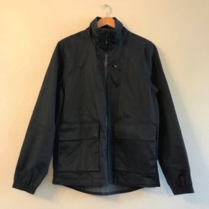Nike Men’s 100% Cotton Canvas Jacket with Hood. Black cotton canvas fabric has a sheen to it and feels slick like there is some waterproofing to the fabric. Nylon lightweight hood zips into collar. Two front box pockets with snaps. Soft cotton interior with polyester sleeve lining.