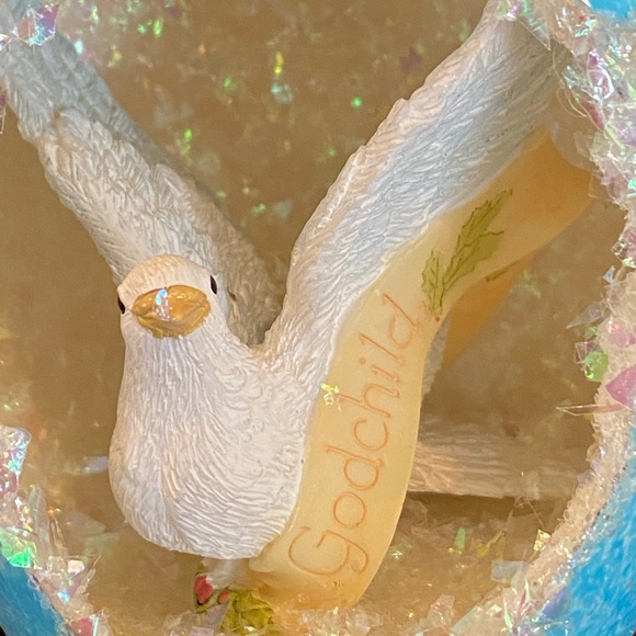 This one of a kind creation is made from a real Emu egg, carved, painted and decorated with a new, retired, vintage Hallmark Dove ornament with Godchild on the ribbon draped across surrounded by iridescent flakes in the background. Stand attached and included. This item has been wrapped and stored. It is in brand new condition. I take special care of the pieces I create!!
