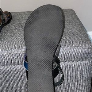 Urban Outfitters, sandal, black with dark navy blue strap in middle, buckle on side, lightweight, any wear is shown in pictures